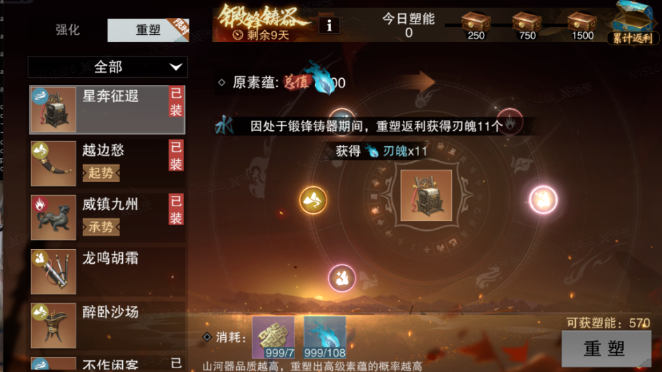 重塑的过程还能同时获得塑能,累计塑能可以获得活动返利奖励。希望获取高级素蕴的少侠可千万不能错过!