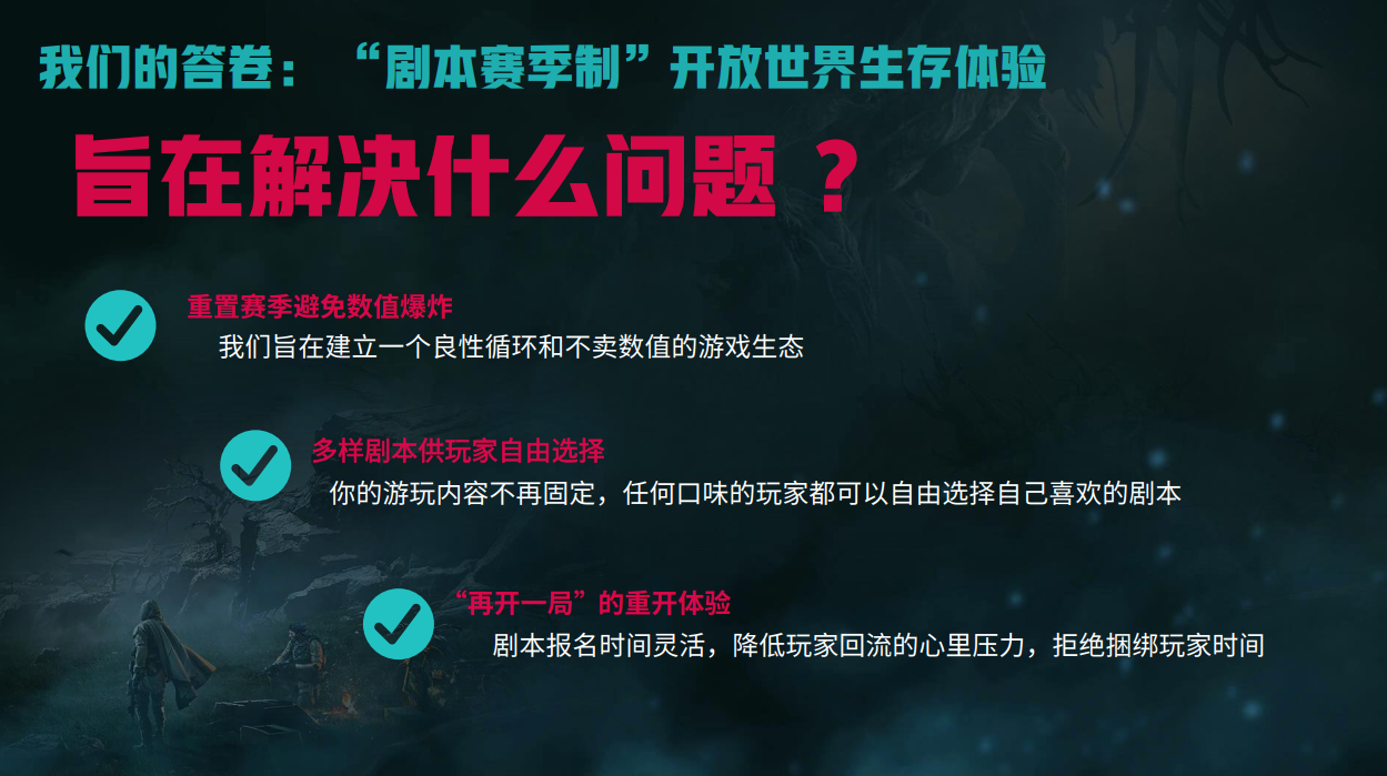 在展会上,开发组还正式官宣了“剧本赛季制”。每个赛季开始前,玩家可自由选择报名喜欢的剧本内容进行体验。《七日世界》可能是全球首个采取赛季制的开放世界游戏,足以可见开发组的创新精神。