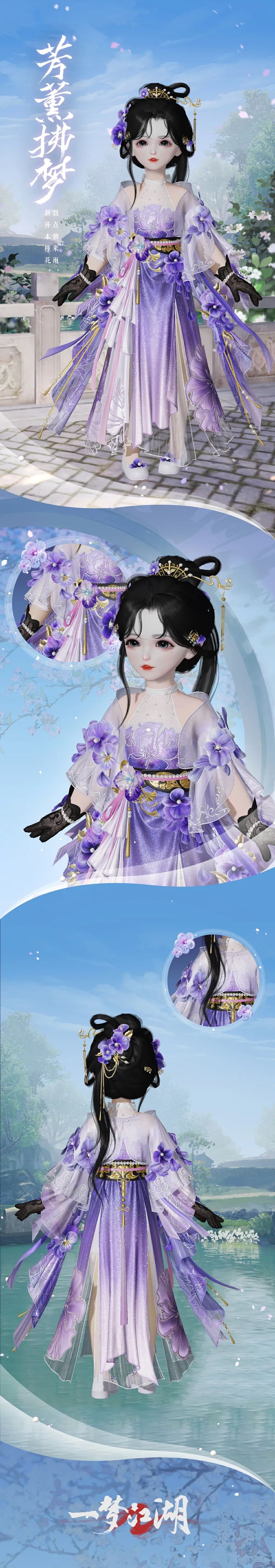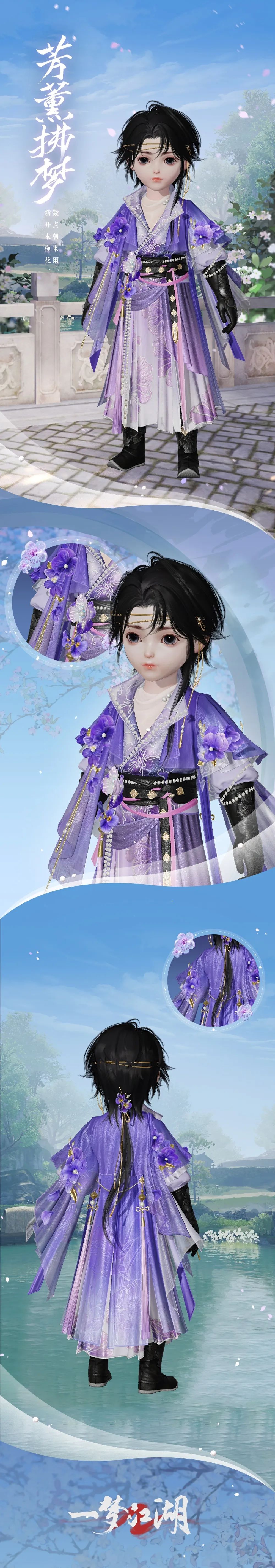 时装·芳薰拂梦取色自三色堇的深浅不一的紫色,袍摆轻曳,似花浪翻滚,衣袖舞动,如花影婆娑。让少侠穿上这件锦裳,无时无刻都能让春日盛景现于眼前。穿行于春日之中,沉醉于自然之美,成为人群中最飘逸出尘的一抹春色。