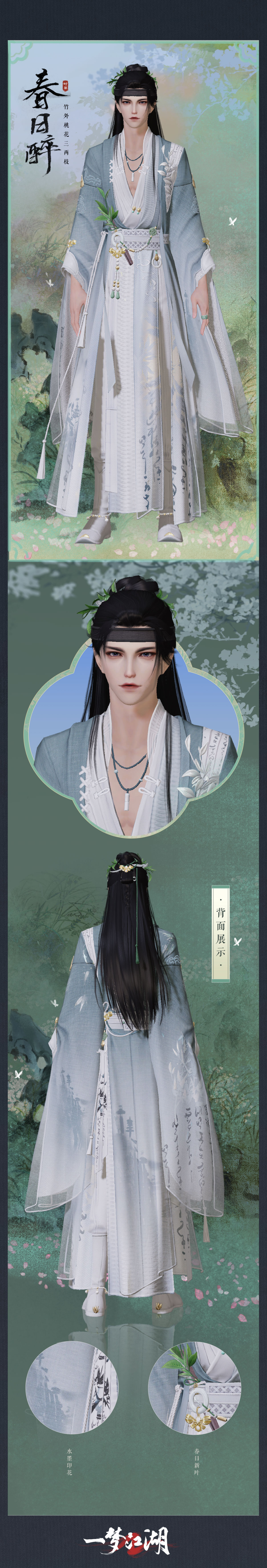 大师傅以这次出游为灵感,精心设计了别致的花朝节时装。借鉴画中芙蓉与竹叶的形态与色彩,巧妙地将工笔画与书法艺术的魅力融入设计之中,愿与少侠们一同陶醉于跃然纸上的盈盈春光。