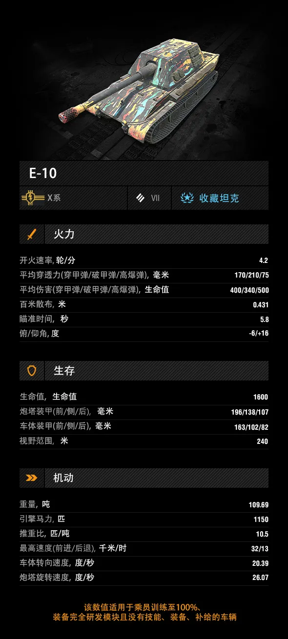 VII级E-10 :移速缓慢但装甲坚固,并具有强大的破坏力。它的装甲足以让所有同级别的敌人大吃一惊。