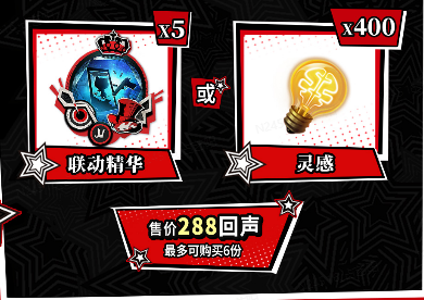 2024年8月2日-2024年8月31日,【P5R联动特惠礼包】限时上架商城,礼包包含自选【Persona5联动精华1】或者【Persona5联动精华2】x5或者400灵感,售价288回声最多可购买6份。