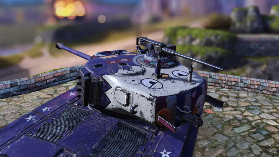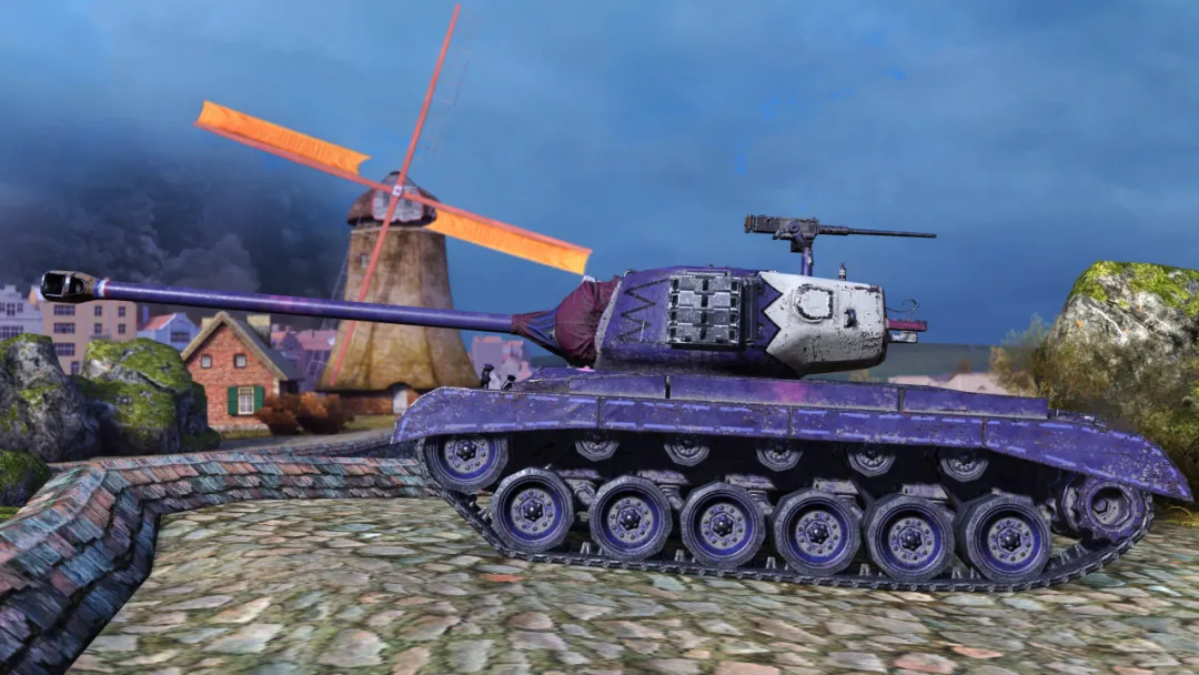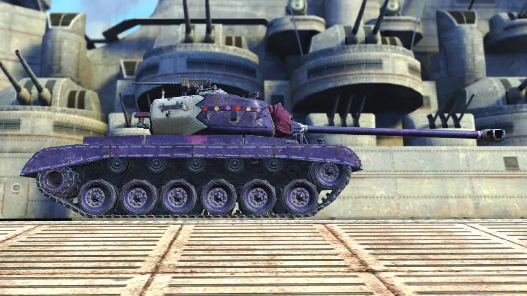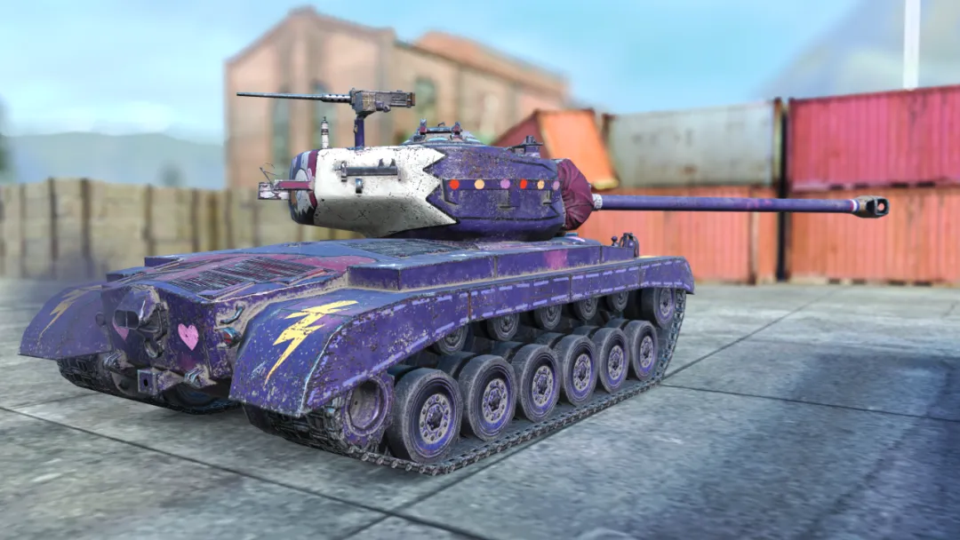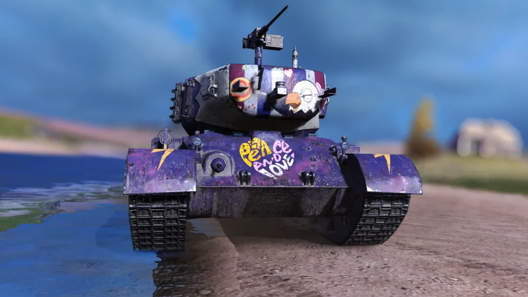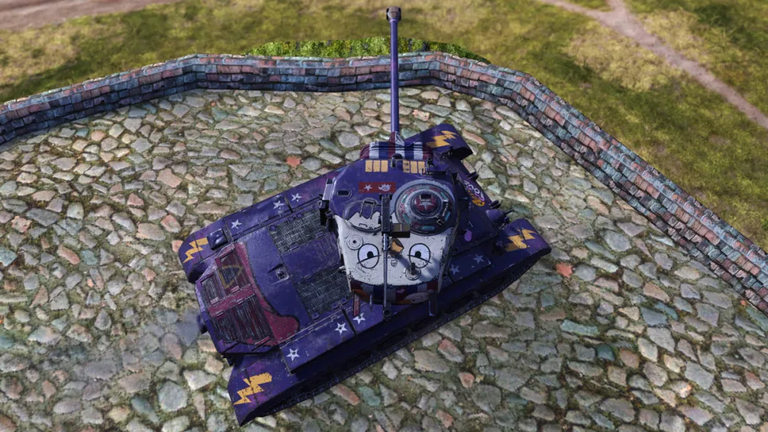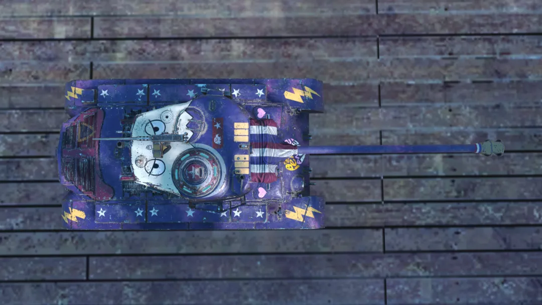 瞧瞧这涂装!神秘而高贵的紫色底色,车体上点缀的星星和条纹,动感十足;最亮眼的还要数履带板上的闪电图案,披上它,“世界警察”就能如闪电般驰骋战场!