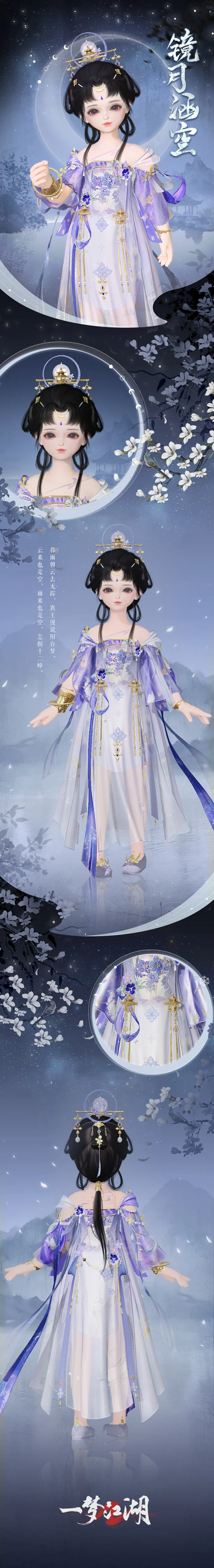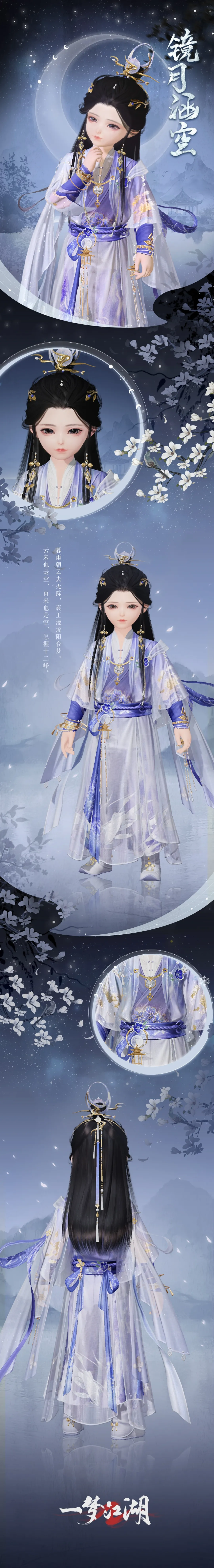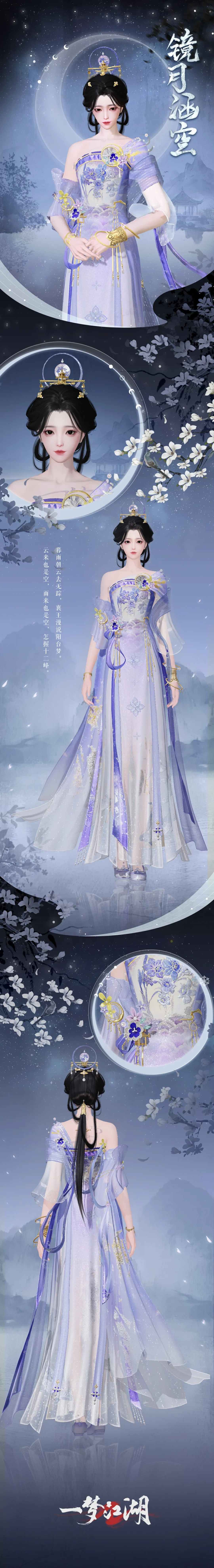 时装·镜月涵空以夜色倒映水面为灵感,在半透的裙摆衣袂间复刻出波光粼粼、弯月入水的波纹。轻纱缀以淡紫,似暮色低垂却有月色照千里。既有水面的透亮澄澈,又似一轮弯月的飘然若仙。胸前更有万花镜般流光溢彩的装饰,为清雅的时装更添上一丝仙姿风华。