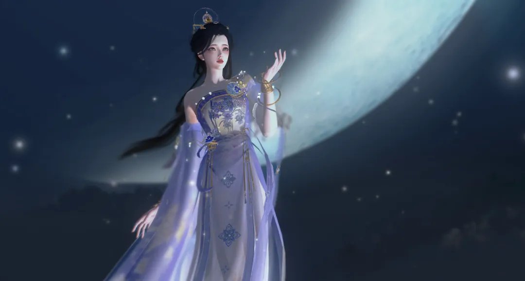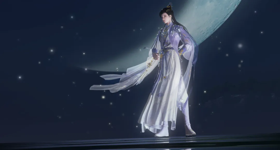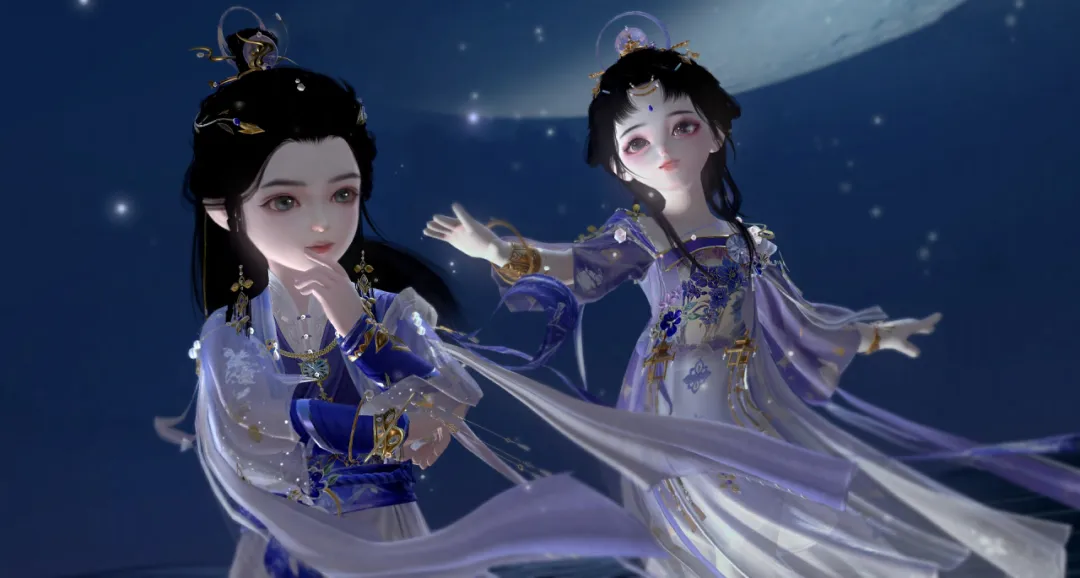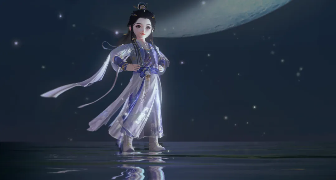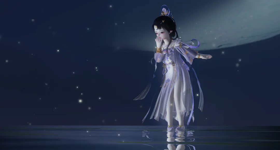 时装·镜月涵空以夜色倒映水面为灵感,在半透的裙摆衣袂间复刻出波光粼粼、弯月入水的波纹。轻纱缀以淡紫,似暮色低垂却有月色照千里。既有水面的透亮澄澈,又似一轮弯月的飘然若仙。胸前更有万花镜般流光溢彩的装饰,为清雅的时装更添上一丝仙姿风华。