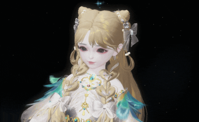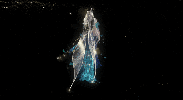 阳文阴漫,乍合乍散。离披晃朗,错杂绫曼。大师傅自凤凰初生之羽中获得灵感,便采撷星霜浣纱,以月光濯锦,织就轻盈的披肩头饰,其形如凤凰涅槃时初展的羽衣,点星辰牵帷幔,制成头饰·轩翥绫辉。