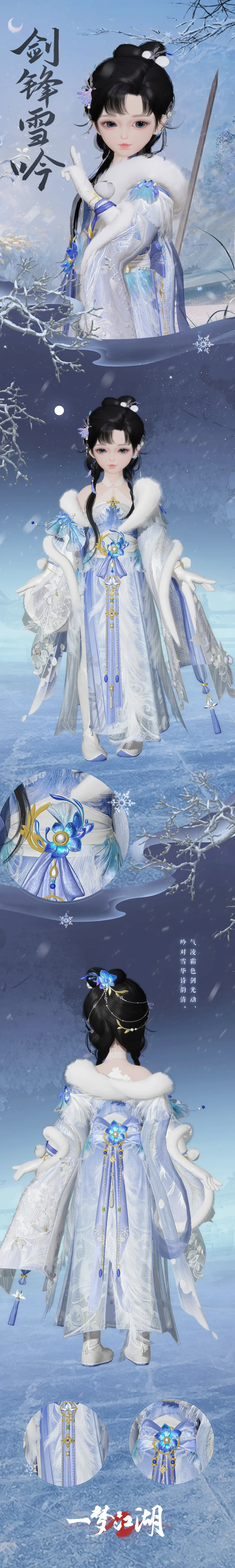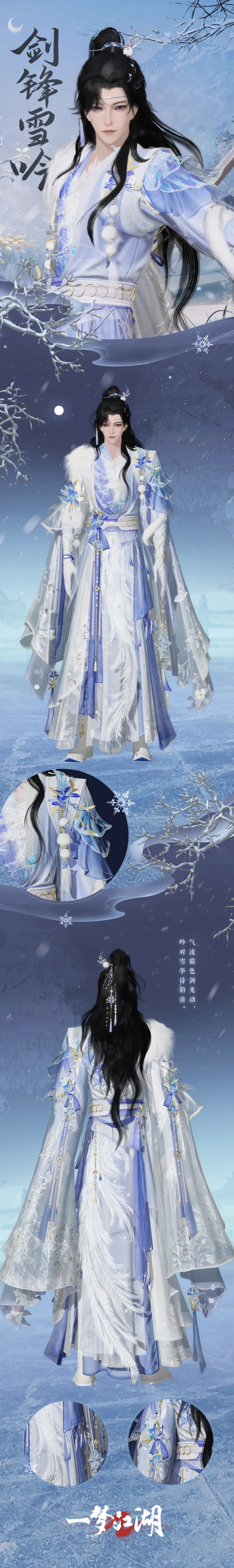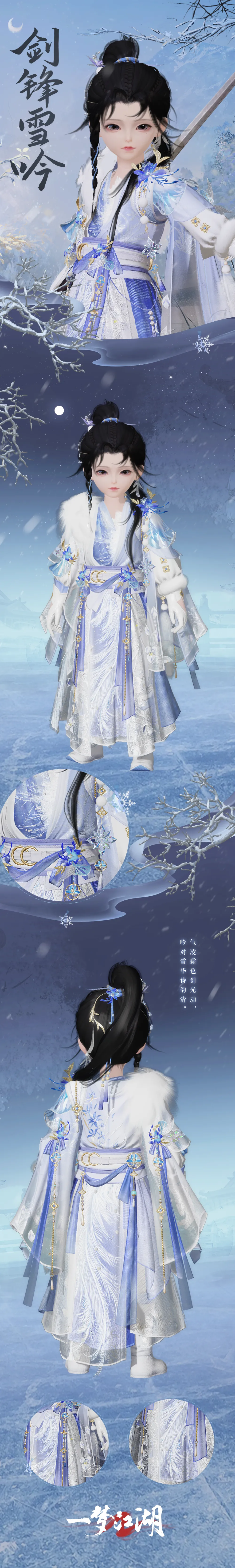时装以冰蓝琼花为色,裁霜为绫,织雪为罗。素雅纯白的裙衫,织就冰霜花纹,象征侠与剑的快意豪情。时装以兰花与雪花作点缀,色彩淡雅清幽,姿态奔放飘逸,一如侠者骨硬而魂秀的君子品格。