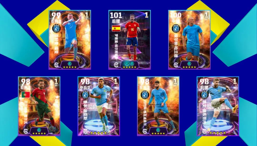 通过【蓝月当空 梦幻精选经纪人】和【双雄争霸 经纪人】,你将可以获得双增能梦幻精选罗德里,增能梦幻精选福登、哈兰德、贝尔纳多·席尔瓦、格瓦迪奥尔,梦幻精选迪亚斯、德布劳内!
