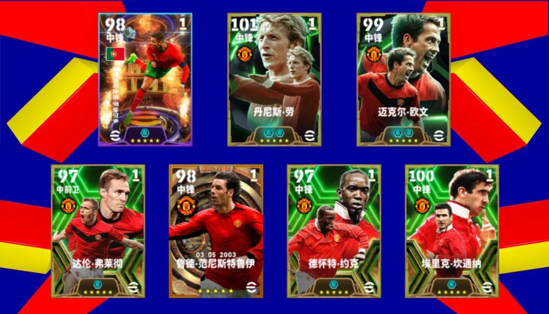 通过【红魔荣耀 经纪人】和【双雄争霸 经纪人】,你将可以获得双增能史诗高光丹尼斯·劳、欧文,增能史诗高光坎通纳、弗莱彻、约克,增能梦幻精选克里斯蒂亚诺·罗纳尔多和决胜高光范尼斯特鲁伊!