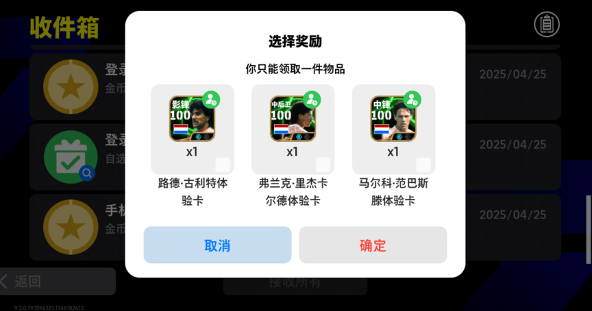 5月1日~5月3日期间累计登录1天,即可任选古利特、里杰卡尔德、范巴斯滕其中一位球员的体验卡,有效期到5月3日23:59:59。