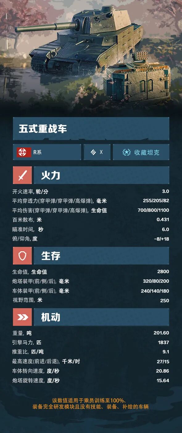 战车寄语:这辆车是一辆有很高强度的并且娱乐性极高的重坦。金币弹抗性虽然不高,但是银币弹抗性极高。主炮手感良好,弹种优秀,高达2800的血量,顶牛利用身高配合俯角能打穿大部分车的头皮。就算碰到卖头的起重机或者卖侧的9001,都可以高爆弹喷4-500的伤害(外加坏零件死成员)。但是切记不要单走,最好身边有补伤害的队友,将会发挥这辆坦克最大的性能。