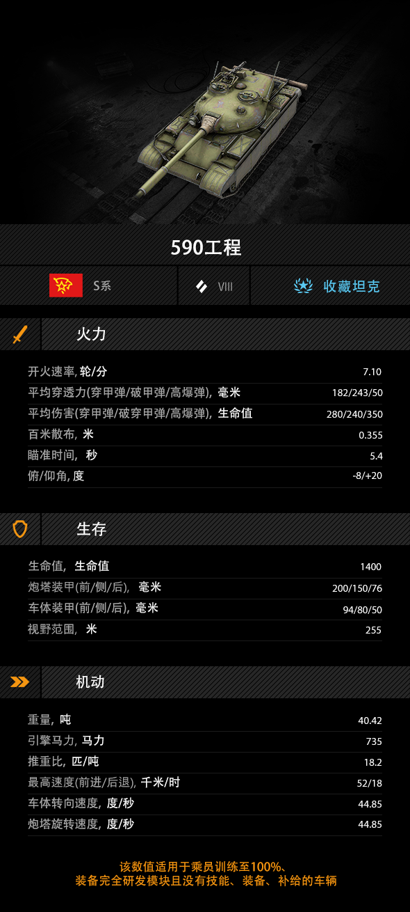 590工程搭载一杆100毫米主炮,平均伤害为280/240/350,平均穿透为182/243/50,输出能力可观。移动射击精度良好,配合8度俯角和20度仰角,能够适应多种复杂地形作战,良好的机动性能,能及时抵达关键位置进行火力支援。