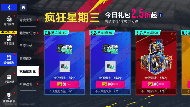 【疯狂星期三】仅在周三12-14时、18-20时与21-23时开启,全服玩家都可参与,活动期间可用超低价购买超值商品,每件商品均有限购数量,售完即止。