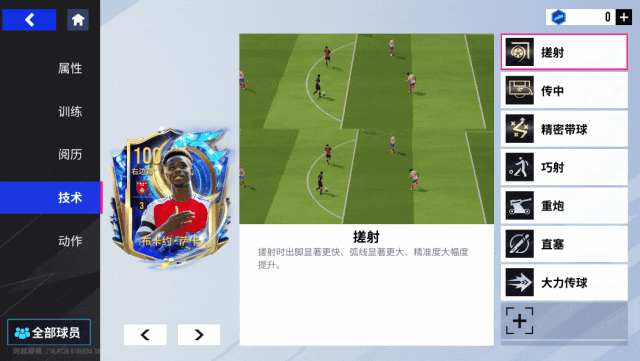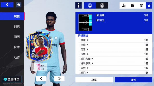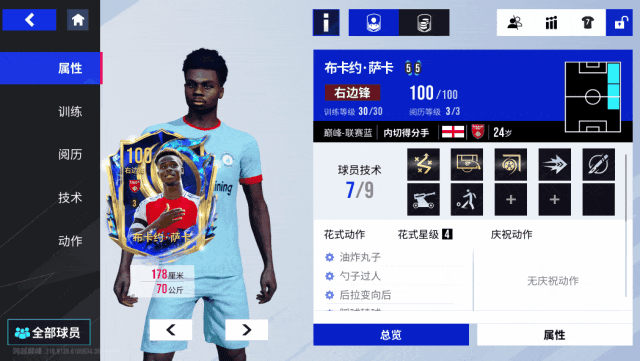 布卡约·萨卡拥有边路爆破能力和手术刀般的传中技艺,108带球与105控球,更兼具109灵活,在金色【精密带球】的加持下,他能于方寸之间翩翩起舞,将防守球员的重心玩弄于股掌,是名副其实的边路杀手。109传中搭配金色【传中】技术,更让他的每一次起脚都成为艺术,皮球划出奇妙的弧线,以惊人的准度找到队友,他的传中就是球队最致命的进攻武器!他不仅是一位创造大师,更是一位冷血终结者!107远射搭配104射门搭配金色【搓射】技术让他在内切后既能用搓射,也能轰出势大力沉的世界波。106速度与109加速,则意味着一旦让他获得冲刺空间,便将化为一道无法阻挡的红色魅影。106的体力与91抢断,萨卡总能不遗余力地往返奔跑,为球队攻防两端注入无限活力。这就是萨卡,一位将速度、技术、智慧和创造力完美融合的边路至尊!