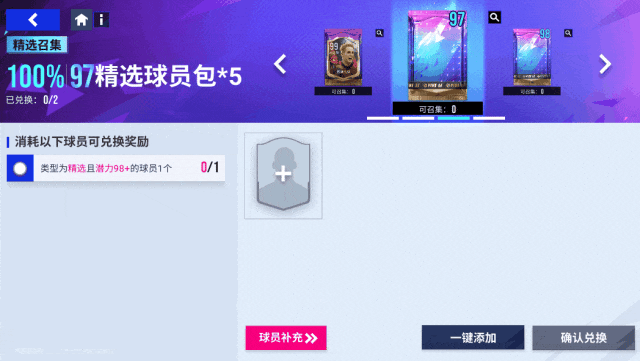 【97精选随机包】阵容召集挑战将于9月16日11时至9月19日11时开启。活动期间每日可进行2次召集挑战,按条件使用1个98精选球员进行召集,可拆分获得5个【97精选随机包】。