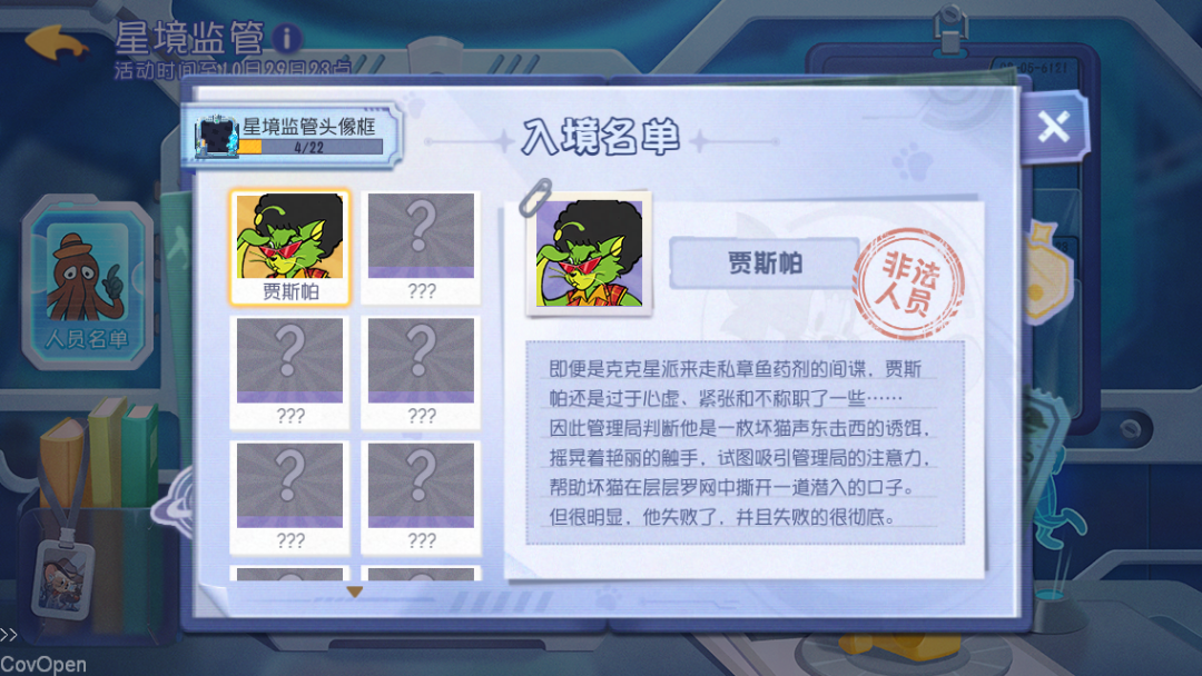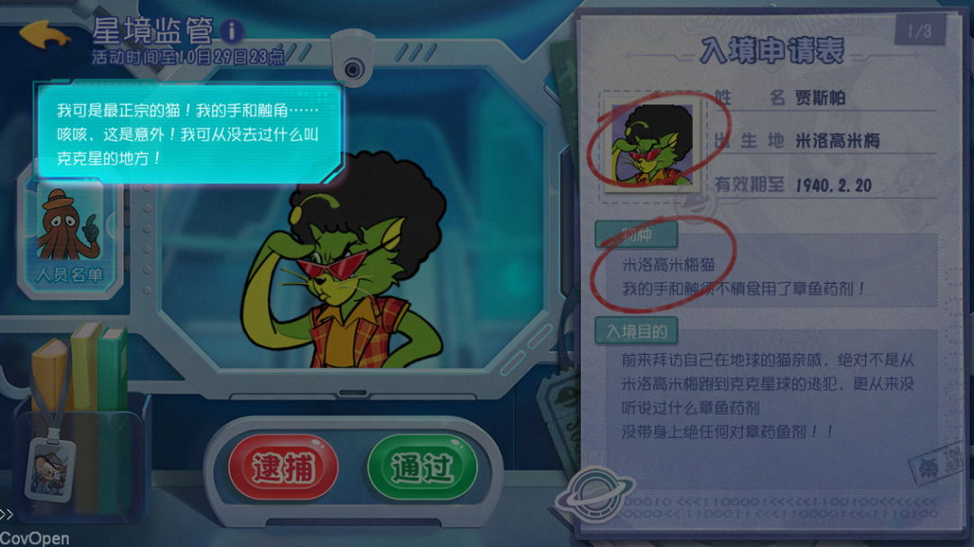 9月25日更新后,小伙伴们通过审查入境人员的申请表,排查其中的可疑细节,对入境者作出“逮捕”或“通过”的处理,即可领取专属奖励——星境监管头像框!
