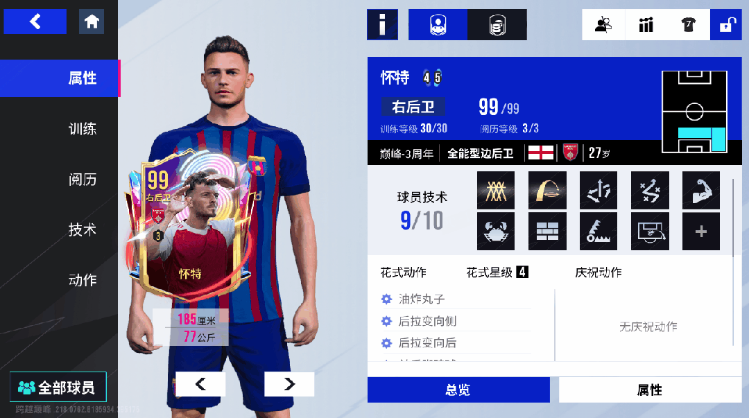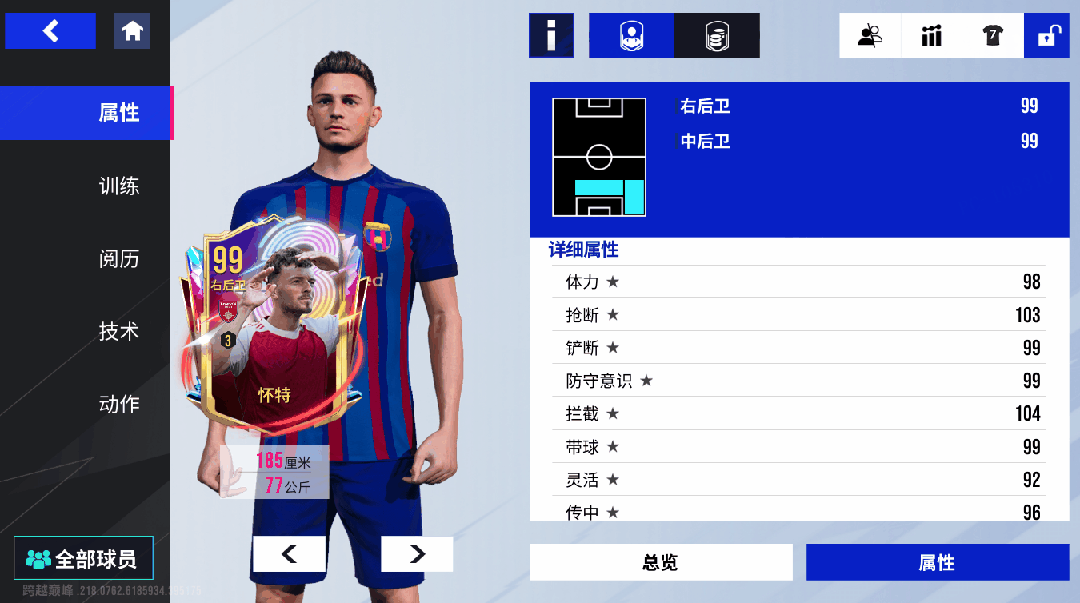 这张 99 潜力值的怀特能自如切换右后卫与中后卫,彰显出 “拦截铁闸 + 精准出球” 的全能防守特质!金色【拦截】技术的赋能,让他拦截范围显著更宽、反应速度愈发迅捷,直接夺取球权的概率大幅提升;103 抢断、99 防守意识搭配 104 拦截,宛如防线前的 “移动城墙”,既能敏锐预判并截断对手进攻线路,又能以干脆的抢断动作瓦解威胁;同时,101 速度与 99 加速的 “回追利刃” 配置,让他在对手反击时能极速补位,98 体力更支撑他全场保持防守压迫感。出球端,102 长传、96 传中结合金色【长传】技术和【Tiki-Taka】技术,无论是大范围转移调度,还是参与阵地战细腻传递,都能精准梳理进攻节奏;95 头球也让他在防空对抗中不落下风。这般集拦截硬度、回追速度、精准出球于一体的表现,让他成为令对手进攻群头疼不已的 “全能战士”!