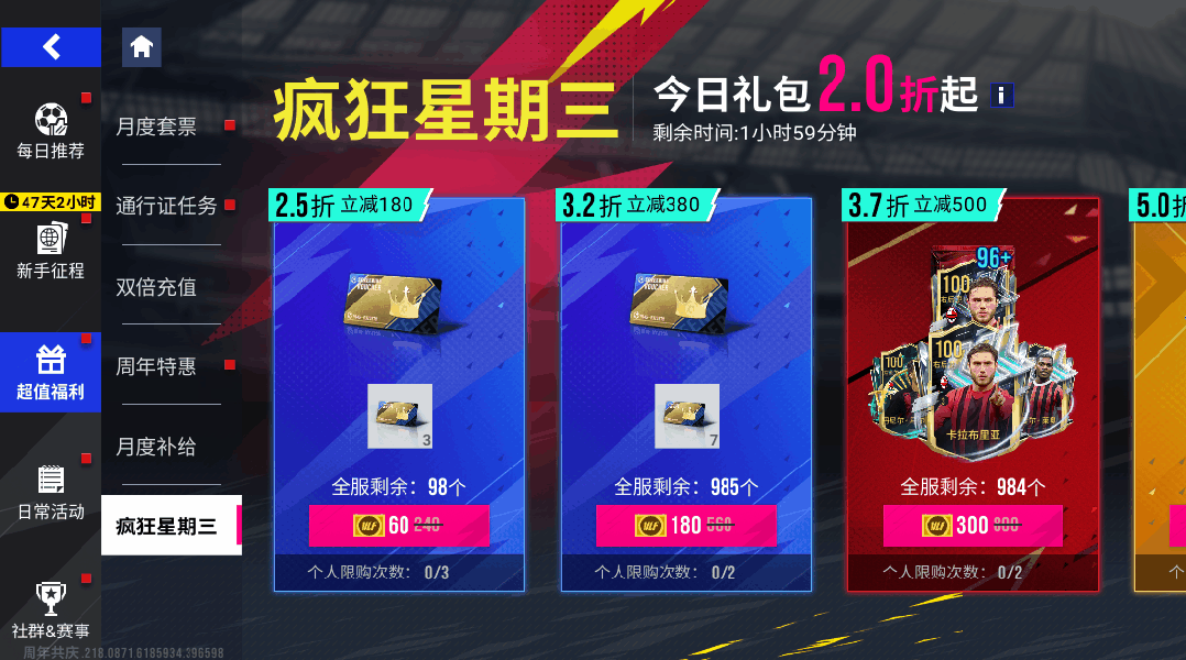 【疯狂星期三】仅在周三12-14时、18-20时与21-23时开启,全服玩家都可参与,活动期间可用超低价购买超值商品,每件商品均有限购数量,售完即止。