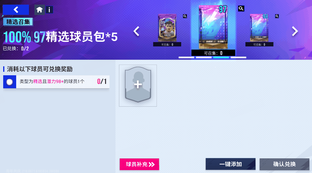 【97精选随机包】阵容召集挑战将于9月23日11时至9月26日11时开启。活动期间每日可进行2次召集挑战,按条件使用1个98精选球员进行召集,可拆分获得5个【97精选随机包】。