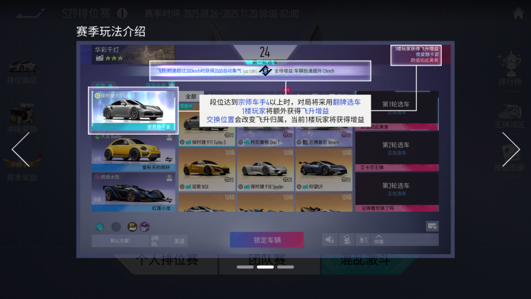 在S29赛季,所有段位的组队排位赛中,每局都将随机触发一种全场增益,车手们可以在选车界面中间位置查看当前增益效果,针对性地选出能将增益效果最大化的车辆阵容。