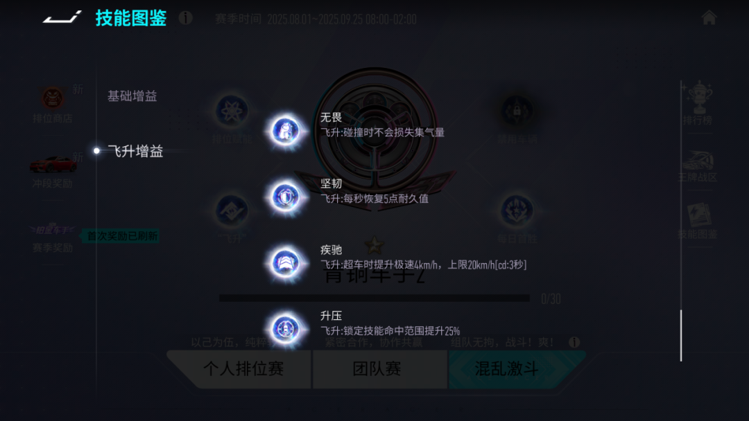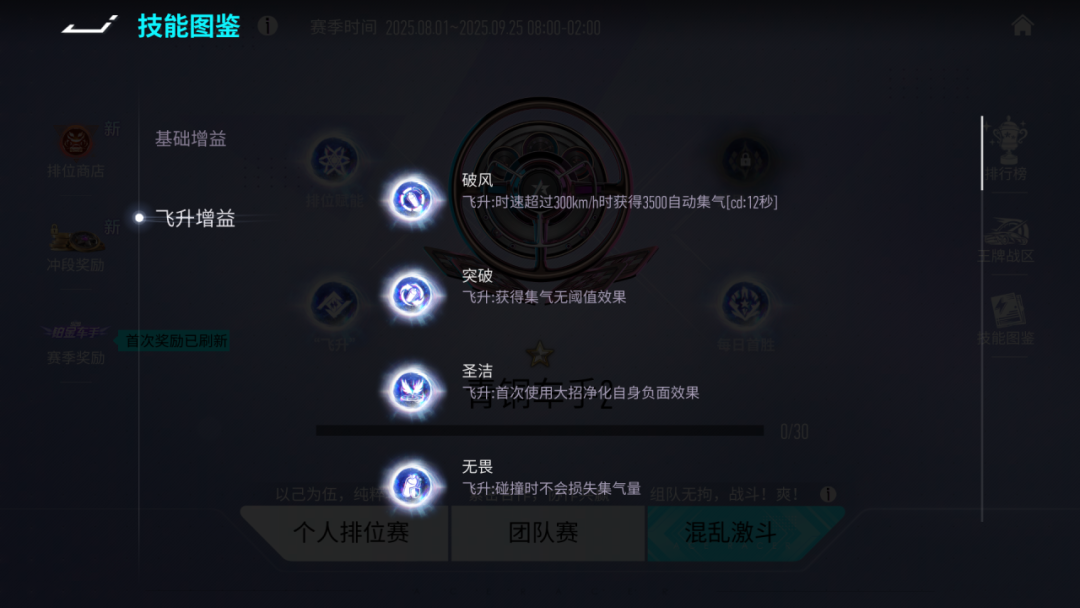 飞升增益分为“破风”、“突破”、“圣洁”、“无畏”、“坚韧”、“疾驰”、“升压”共7种,车手们同样可以点击下图提前了解具体效果,为新赛季上分做准备!