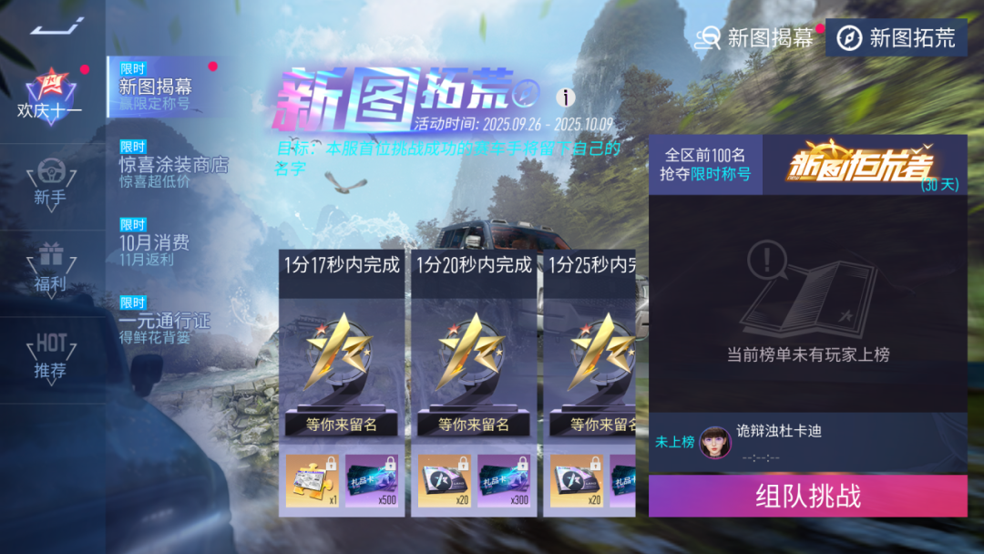 9月26日-10月9日,新图揭幕系列活动将同步开启,完成对应任务累计积分,即可解锁礼品点与万能零件奖励。在新图拓荒活动中,本服第一个完成目标的车手可以在荣誉席上留下自己的名字,活动结束后,新赛道全区前100名的车手还将获得限时专属称号“新图拓荒者”,在新赛道证明你的实力吧~