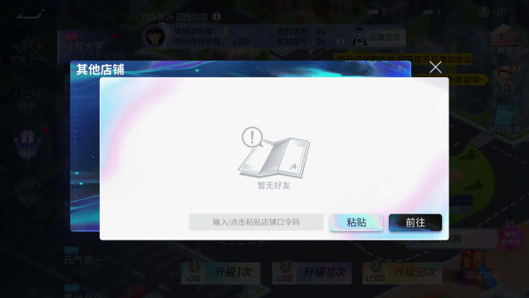在“去打工”选项里也可以直接点击或输入口令码前往好友店铺打工哦~每人每天基础打工次数为2次,每解锁一家店铺可额外获得1次。可消耗打工卡获得额外次数。
