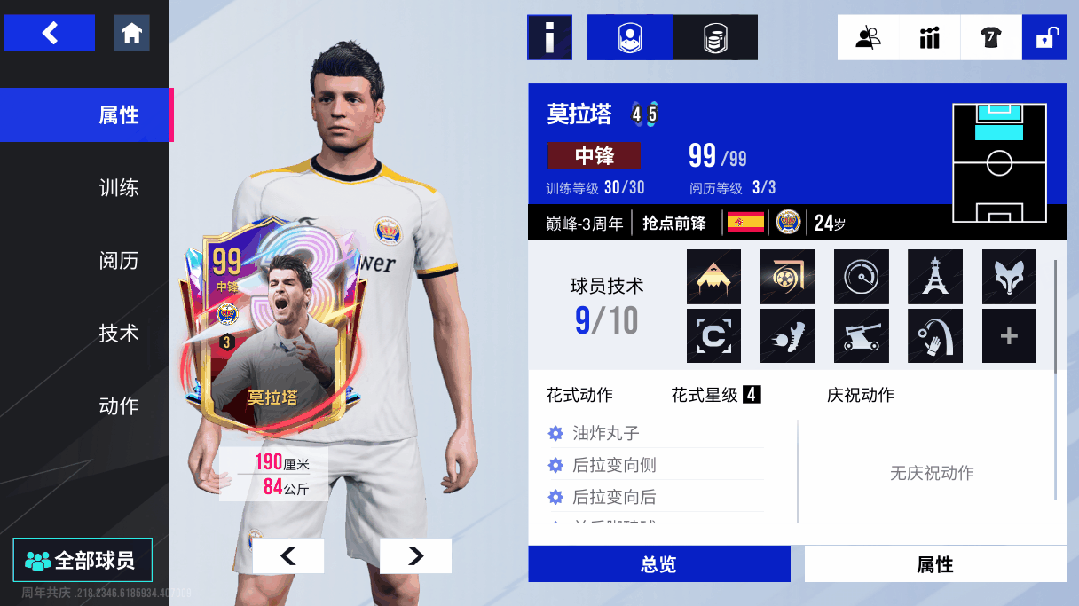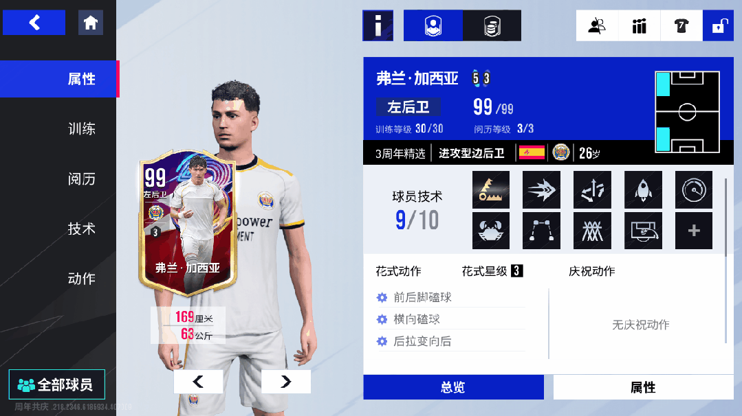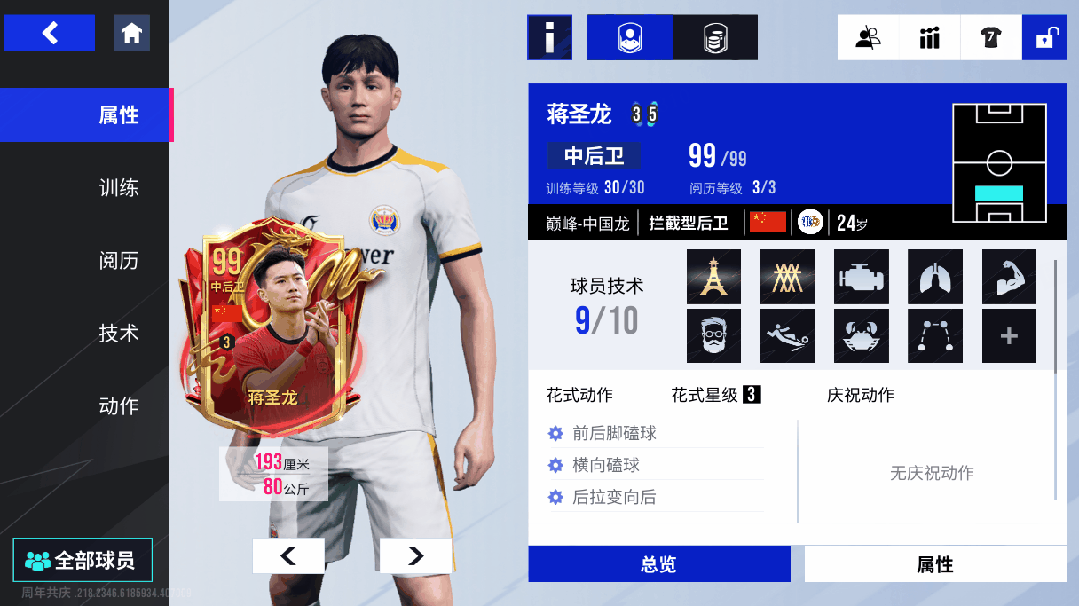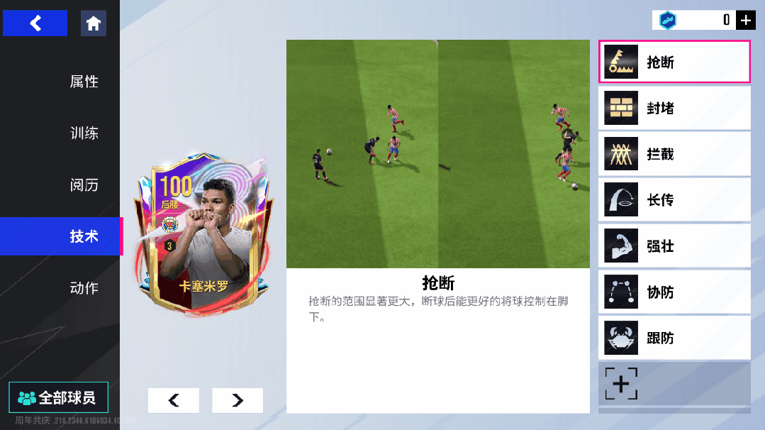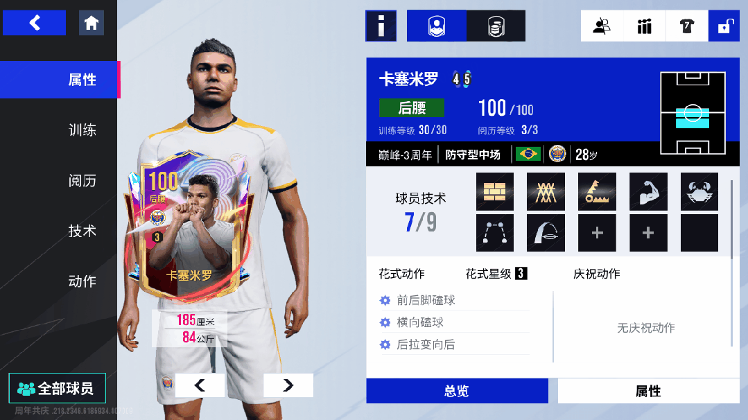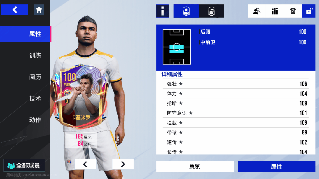 这张 100 潜力值的卡塞米罗作为球队中场核心!拥有金色【抢断】【拦截】【封堵】技术的加持,109 抢断、109 拦截搭配 101 防守意识,宛如 “中场绞肉机”,能以精准且强硬的抢断、拦截撕碎对手进攻线路;106 强壮与 104 体力,更支撑他在对抗中牢牢掌控主动,全场保持高强度的防守压迫。进攻端,106 射门力量、99 远射的配置,让他后插上射门极具威慑力,能突然给对手球门制造危机;卡塞米罗同样拥有出色的短传能力,102 短传、104 长传又能高效梳理攻防节奏,让球队从防守到进攻的转换井然有序,是球队不可或缺的 “全能铁腰”!