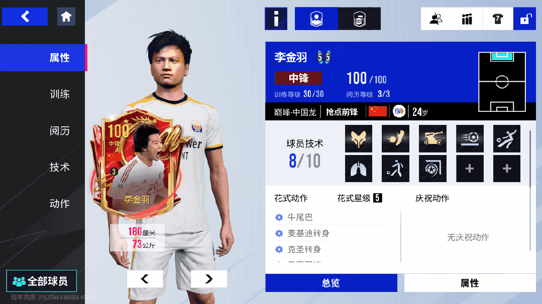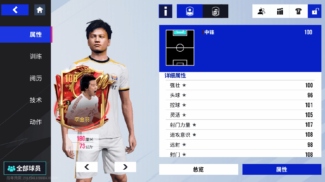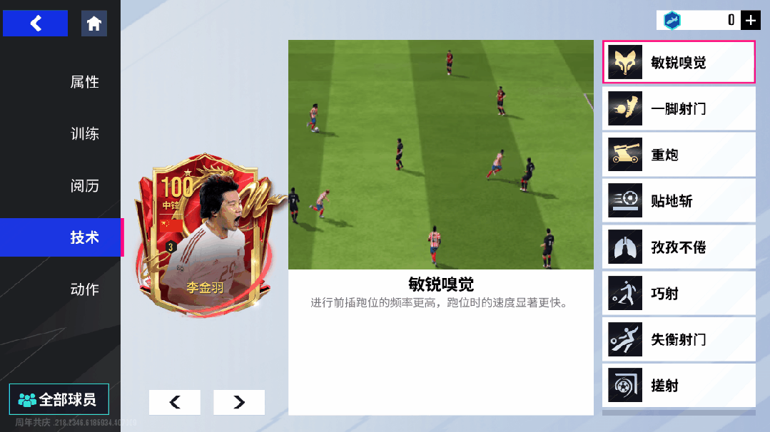 作为中国传奇射手,这张 100 潜力值的李金羽拥有“灵动跑位和暴力终结” 的特点,108 速度与 105 加速的搭配,让他在锋线冲刺时如闪电般迅猛;结合金色【敏锐嗅觉】技术,前插跑位的频率更高、选位更刁钻,总能像猎手般精准出现在最具威胁的得分区域。金色【一脚射门】技术、108 射门、98 远射搭配 107 射门力量,无论是禁区内的抢点爆射,还是禁区外的暴力轰门,亦或是接球凌空抽射都极具摧毁性;金色【重炮】技术和【巧射】技术加持下,更让他的射门方式丰富且致命,搓射、抽射都能精准洞穿球门。此外,100 强壮保证他在对抗中稳稳控住皮球,96 头球也让他具备高空作业的威胁,出色的跑位、恐怖的终结力与对抗优势于一身的个人能力,让他在宛如 “无解锋霸”,仅凭一己之力就能搅乱任何对手的整条防线!