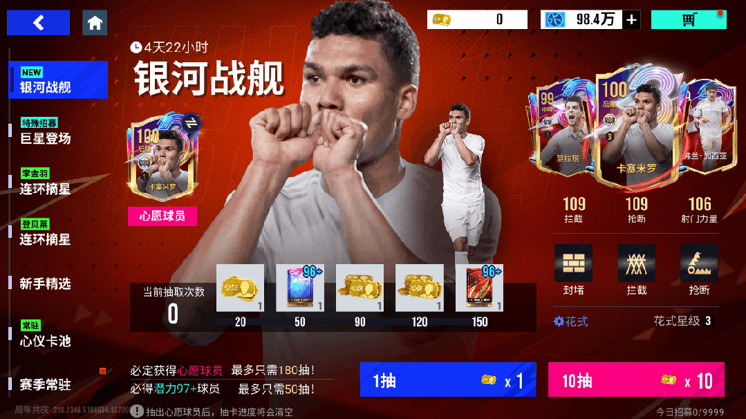 【银河战舰】卡池将于9月29日11时至10月6日11时开启! 每次招募都有概率获得100潜力巅峰卡塞米罗,99潜力巅峰莫拉塔、99潜力精选弗兰·加西亚等球员!