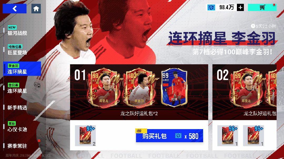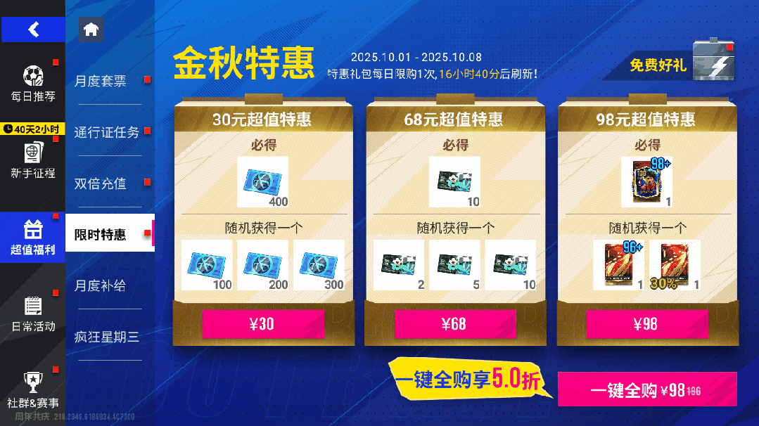 【金秋特惠】惊喜上线!10月1日11时-10月8日活动期间每日登录可以以优惠的价格购买「98+巅峰球员包」「转盘抽奖券」等特惠商品,一次性打包购买更可享超值折扣!