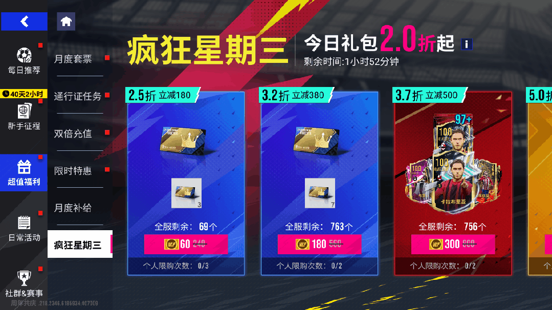【疯狂星期三】仅在周三12-14时、18-20时与21-23时开启,全服玩家都可参与,活动期间可用超低价购买超值商品,每件商品均有限购数量,售完即止。