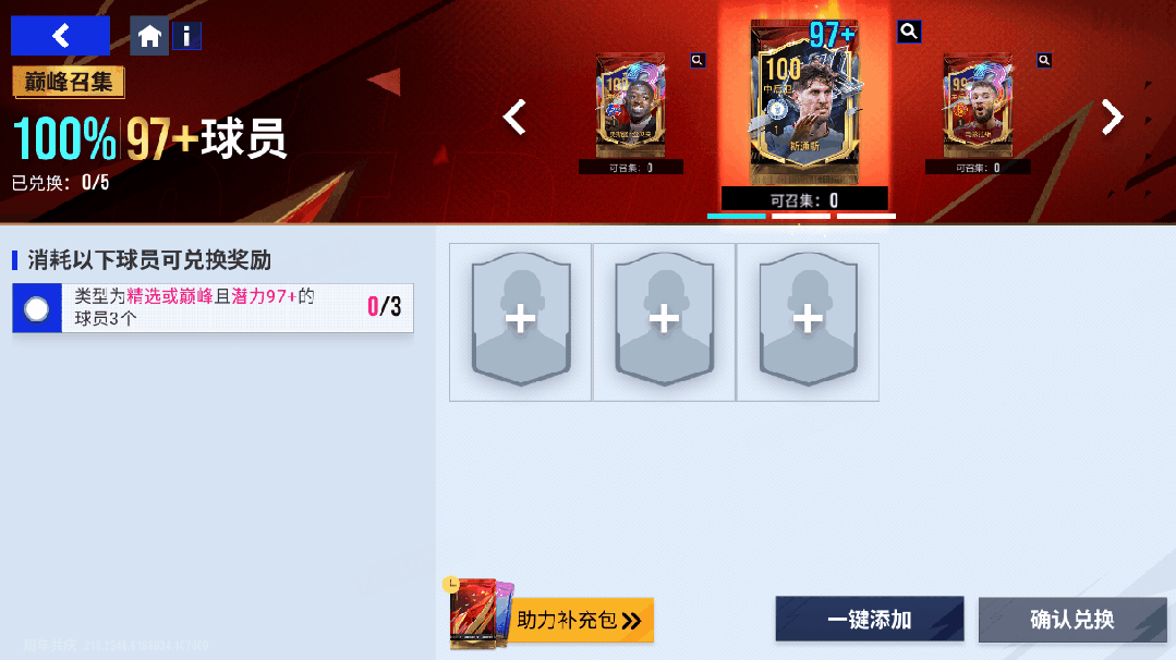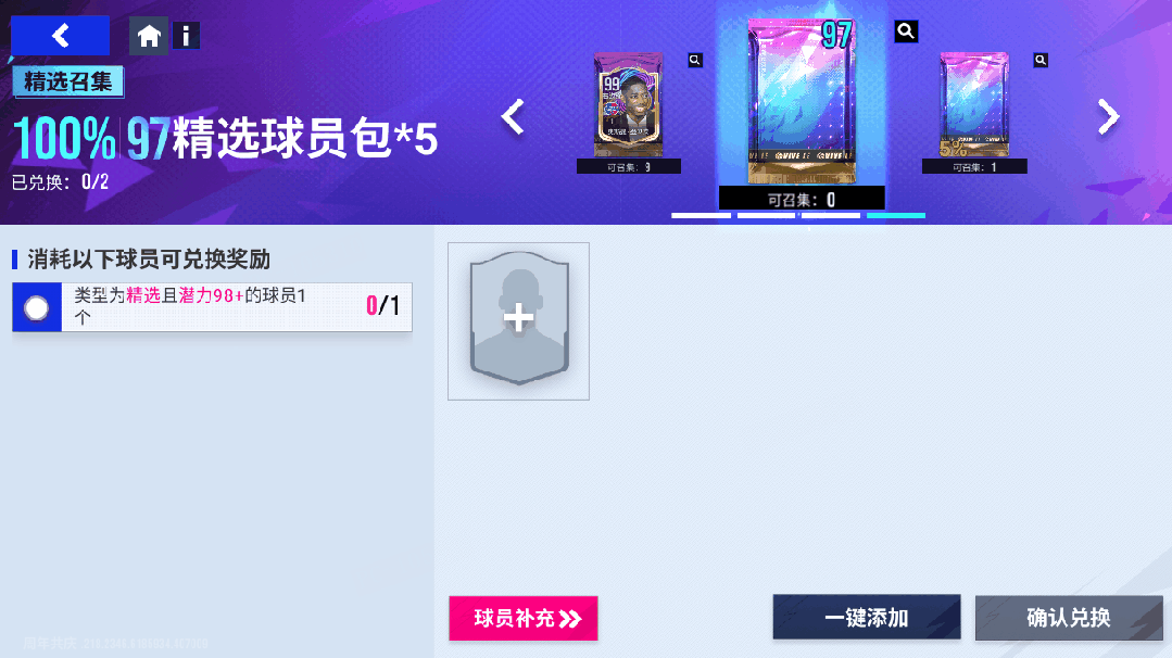 【97精选随机包】阵容召集挑战将于9月30日11时至10月3日11时开启。活动期间每日可进行2次召集挑战,按条件使用1个98精选球员进行召集,可拆分获得5个【97精选随机包】。