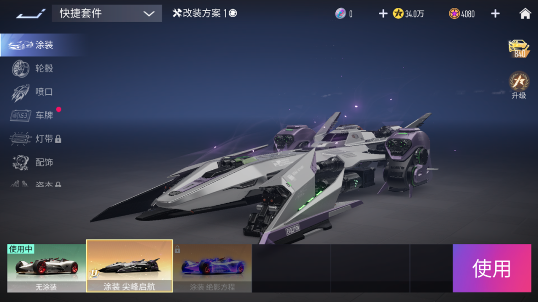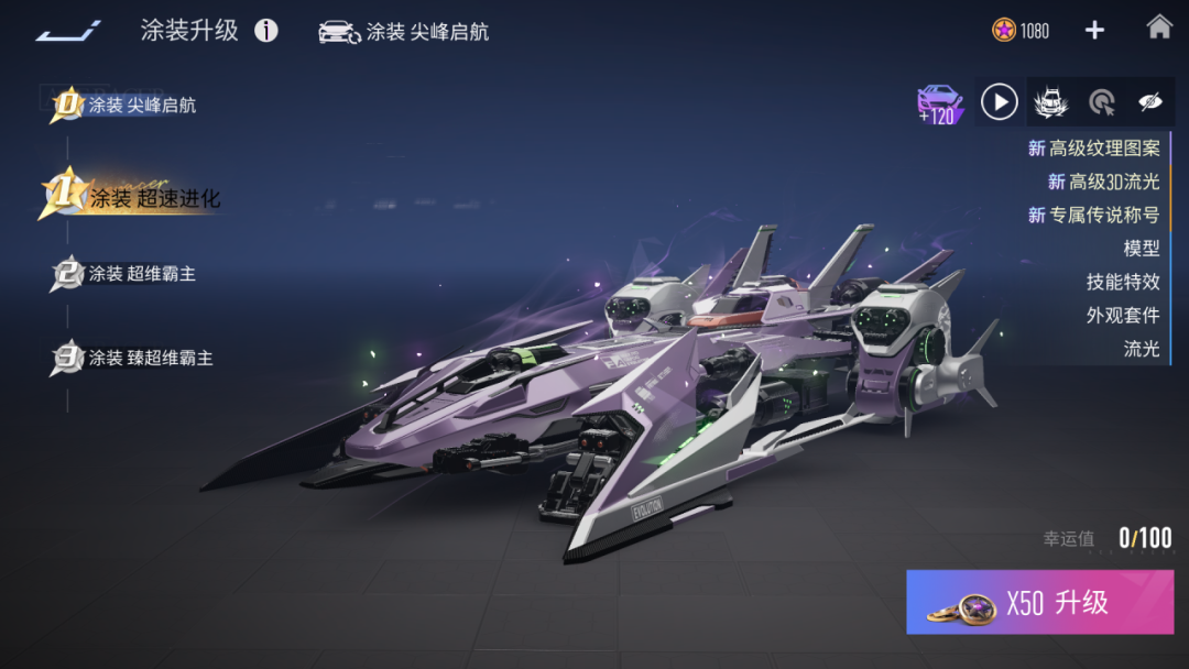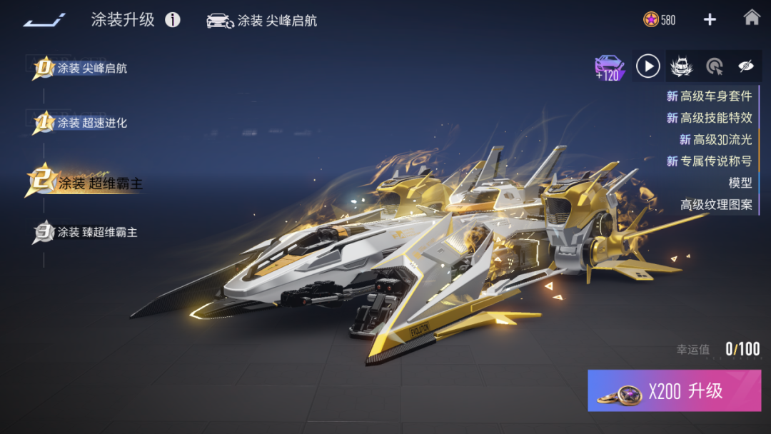 升级成功后获得的全新款式涂装分为多个等级,同一款式的涂装不会重复获得。王牌方程式 EVO-尖峰启航涂装可升级款式共分为三个等级,每个等级都能全新外观以及特殊效果——