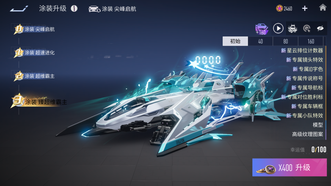 当车手们成功获得可升级涂装后,可以在美容工坊/仓库找到该涂装并点击升级进入升级系统,消耗纪念币/绑币即可为涂装进行升级,解锁更多炫酷特性!