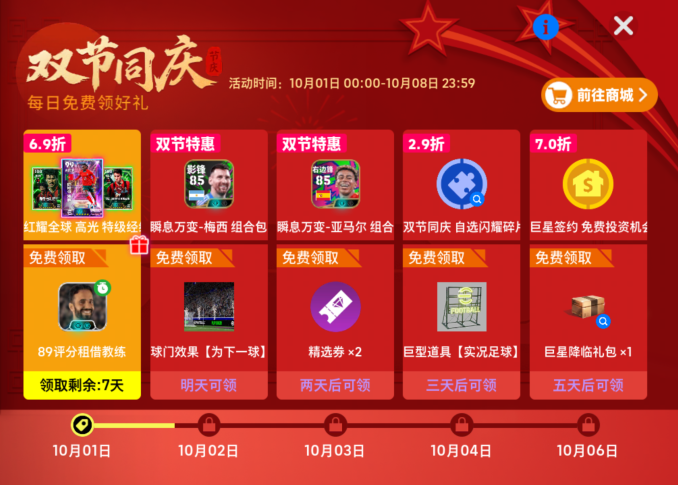 10月4日,玩家可以在【每日赠礼】中免费领取【巨型道具组合包】,还可以在【每日特惠】中消耗3980实况点购买【双节同庆 自选闪耀碎片】*8。