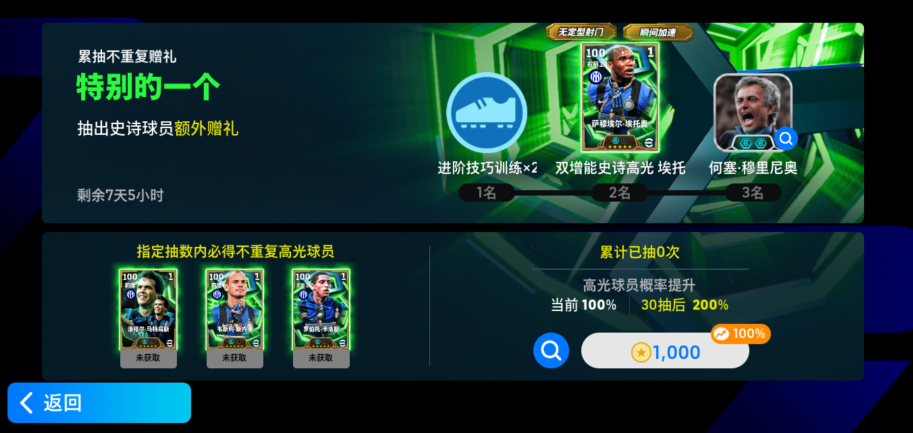 2、玩家抽取到3指定高光球员,可额外获得【双增能教练穆里尼奥】。