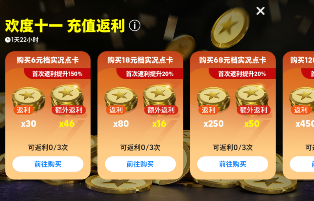 在【充值返利】活动期间,购买对应档次的实况点卡,即可获得额外的金币奖励。首次购买各自档位的实况点卡,还能够再获得额外返利!