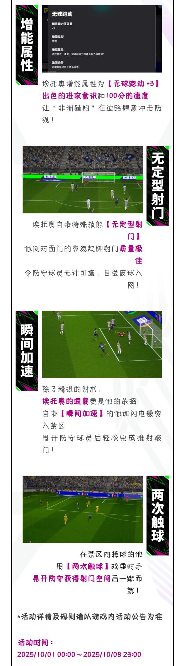 双增能史诗高光埃托奥、卡洛斯、斯内德将通过【特别的一个 概率提升赠礼】首发登场!除此之外,你还有机会获得双增能史诗高光马特乌斯等实力悍将!喜欢他们的玩家,千万不要错过此次活动!