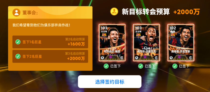 当你已拥有本期的目标球星时,该目标球星会向董事会表达自己希望可以与其他巨星并肩作战,董事会会为你签下其他目标球星追加启动资金——当已拥有一名目标球星时,董事会将追加1600万资金!