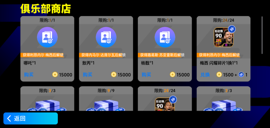 前往【俱乐部商店】还可购买【巨星皮肤】、【闪耀碎片】等道具。梅西限定哪吒皮肤卡、内马尔限定敖丙皮肤卡、苏亚雷斯限定杨戬皮肤卡等你来拿!