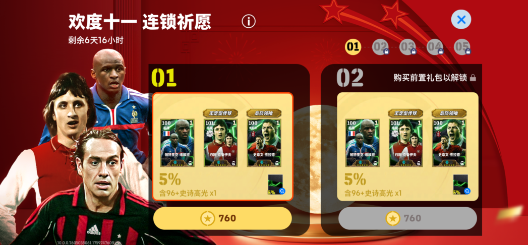 在【欢度十一 连锁祈愿】活动期间,玩家按顺序购买礼包,即可获得【5星经纪人(5%含96+史诗高光)】、【5星经纪人(5%含97分+史诗高光)】、【5星经纪人(10%含98分+史诗高光)】!想要获得他们的玩家,千万不要错过此次活动!