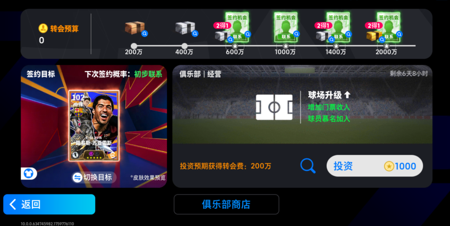 【中秋团圆 巨星签约】活动期间,玩家每次可消耗1000金币经营俱乐部,以增加董事会下拨的转会预算。当转会预算达到一定值时,玩家可领取礼包奖励,其中包括【巨星降临礼包】 、【巨星降临精英礼包】、【巨星降临史诗礼包】和【闪耀碎片自选礼包】,开启礼包最高还可获得【99+评分增能史诗返场经纪人】!同时,签约目标球员的概率也会随转会预算的增加而提升!