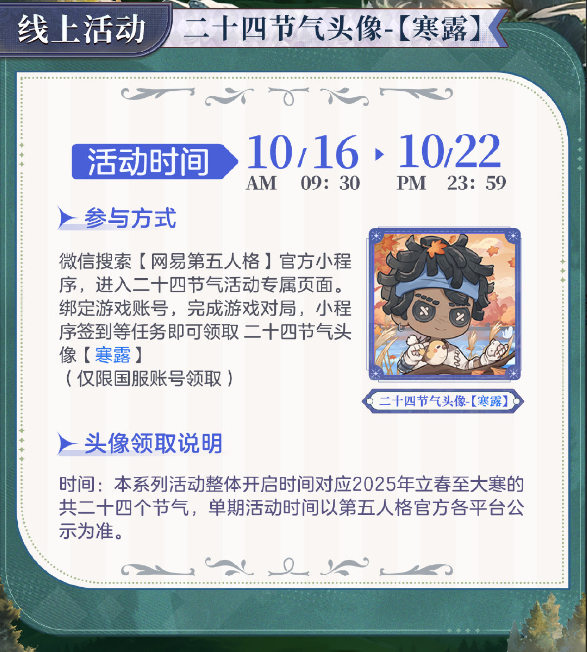 随着寒露线下现场活动的完美落幕,线上活动也在等待各位访客参与。寒露线上活动(10月16日至10月22日)将于【网易第五人格】官方小程序二十四节气活动专属页面内开展,访客们在完成绑定游戏账号、完成游戏对局、小程序签到等任务后即可领取二十四节气头像-【寒露】。画面中,击球手在秋日暖阳下的河边练习,偶遇小鸟在金叶纷飞的场景下立于枯木之上小憩,他上前轻轻抚摸小鸟,面色温柔,享受着这一刻的惬意。