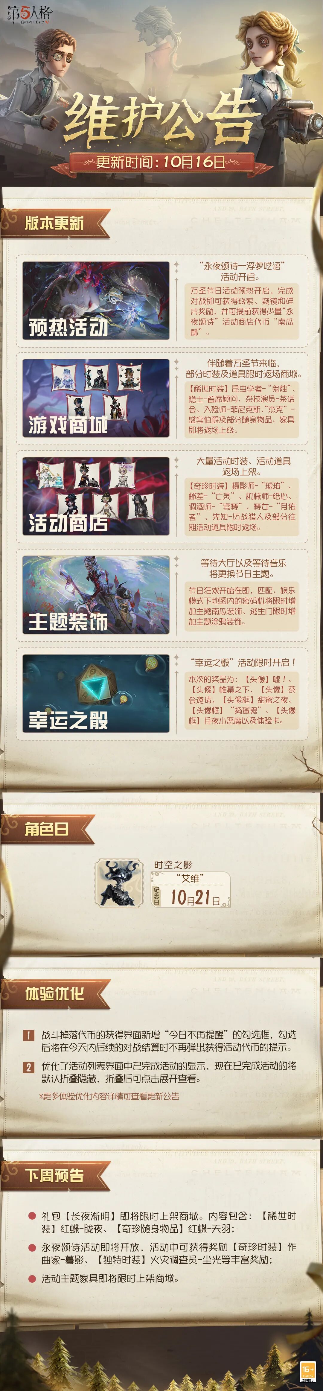 ●万圣节日活动预热开启,完成对战即可获得线索、窥镜和碎片奖励,并可提前获得少量“永夜颂诗”活动商店代币“南瓜酥”。所有模式对战均可完成任务,对局中需达成演绎积分最低要求或完成有效对局行为。
