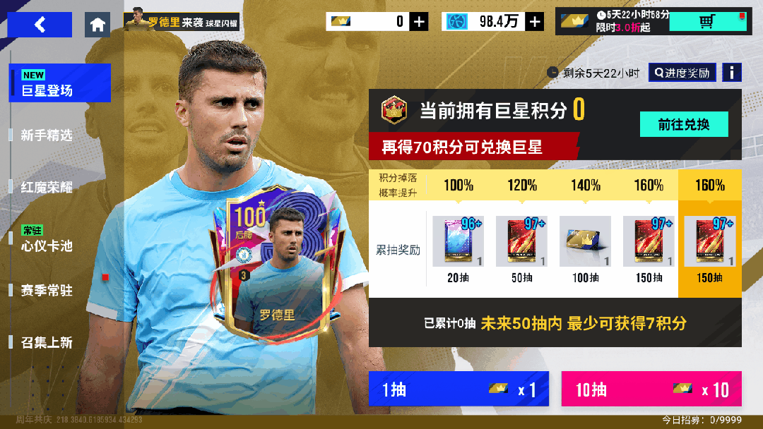 10月17日11时-10月24日11时期间,将开启巨星登场100巅峰-罗德里 ,每次开启都有概率获得巨星积分!可通过巨星积分兑换100潜力巅峰球员罗德里、99潜力巅峰阿坎吉、99潜力精选鲍勃,更可获得进度奖励「96+精选球员包」「97+蓝月军团球星包」「98+蓝月军团球星包」「30%保金精选包」等奖励!