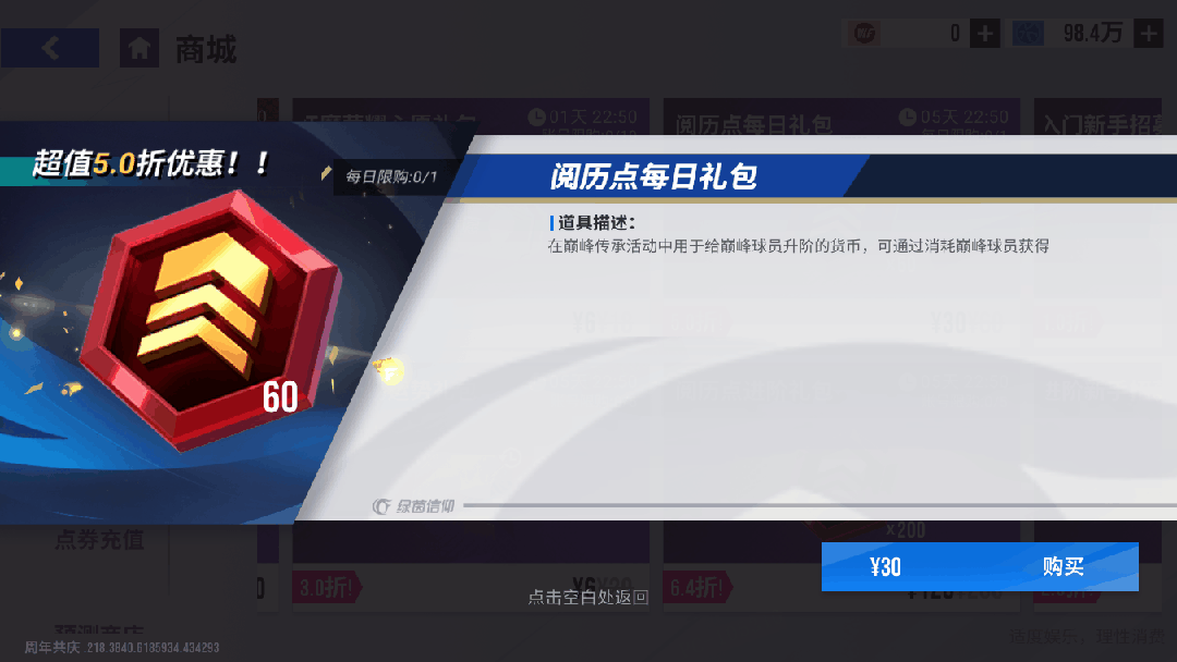 10月17日11时-10月24日11时期间,可在商场购买【阅历点每日礼包】,每日限购1次,购买可获得阅历点*60,仅需30元!