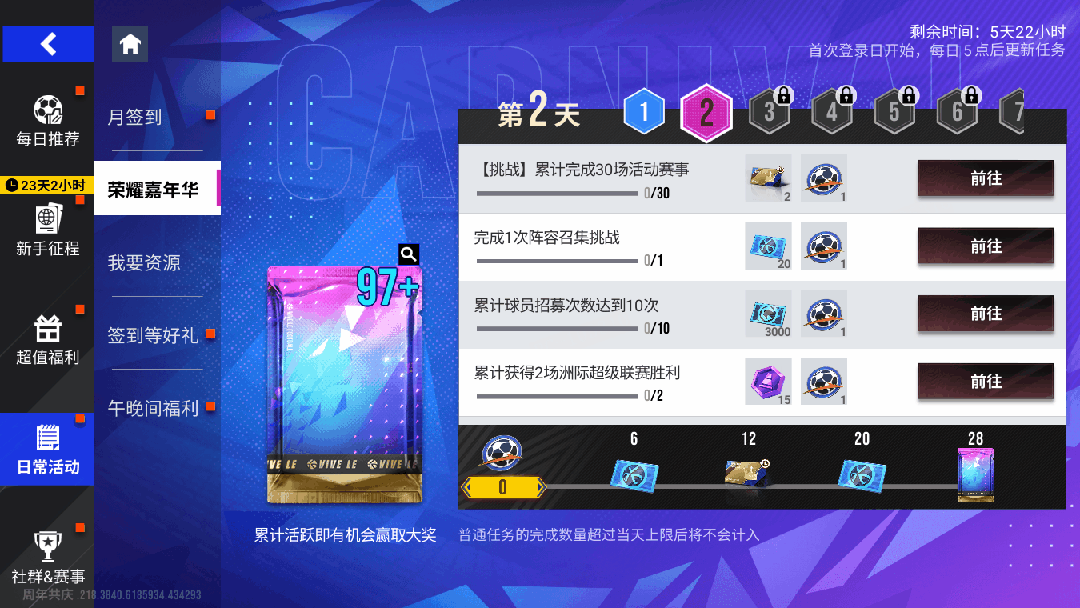 10月17日11时-10月24日11时期间,玩家每日完成活跃任务,即可领取大量道具奖励包括「登场券(限时)」、「动作卡」、「蓝券」等,更可获得「97+精选球员包」!
