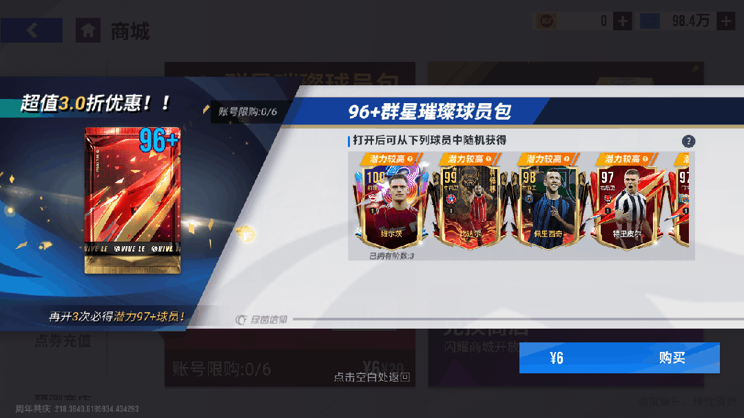 10月17日11时-10月24日11时期间,可在商场购买【96+群星璀璨球员包】,账号限购6次。打开后可获得96-100潜力球员,打开3次必出97+,更有机会获得【100巅峰维尔茨】!