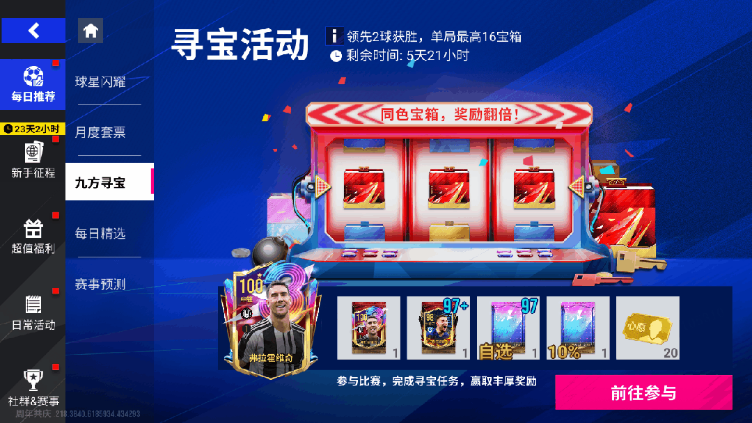 【九方寻宝】10月17日11时至10月24日震撼开启!比赛中快速领先2球就可以获得胜利,并获得一次寻宝机会;同时,比赛中还有随机任务,完成会获得额外奖励。不同的宝箱有对应的积分,尝试获得更多积分,冲击排行榜大奖吧!